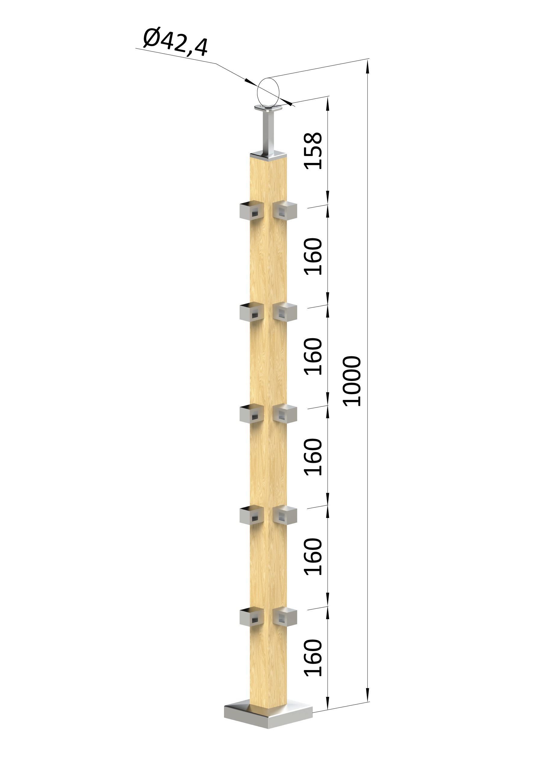 Úvod » Zabradlí a madla » Dřevěné čtvercové sloupy » Vrchní kotvení s úchytkami » Dřevěný sloup, vrchní kotvení, 5řadový, rohový: 90°