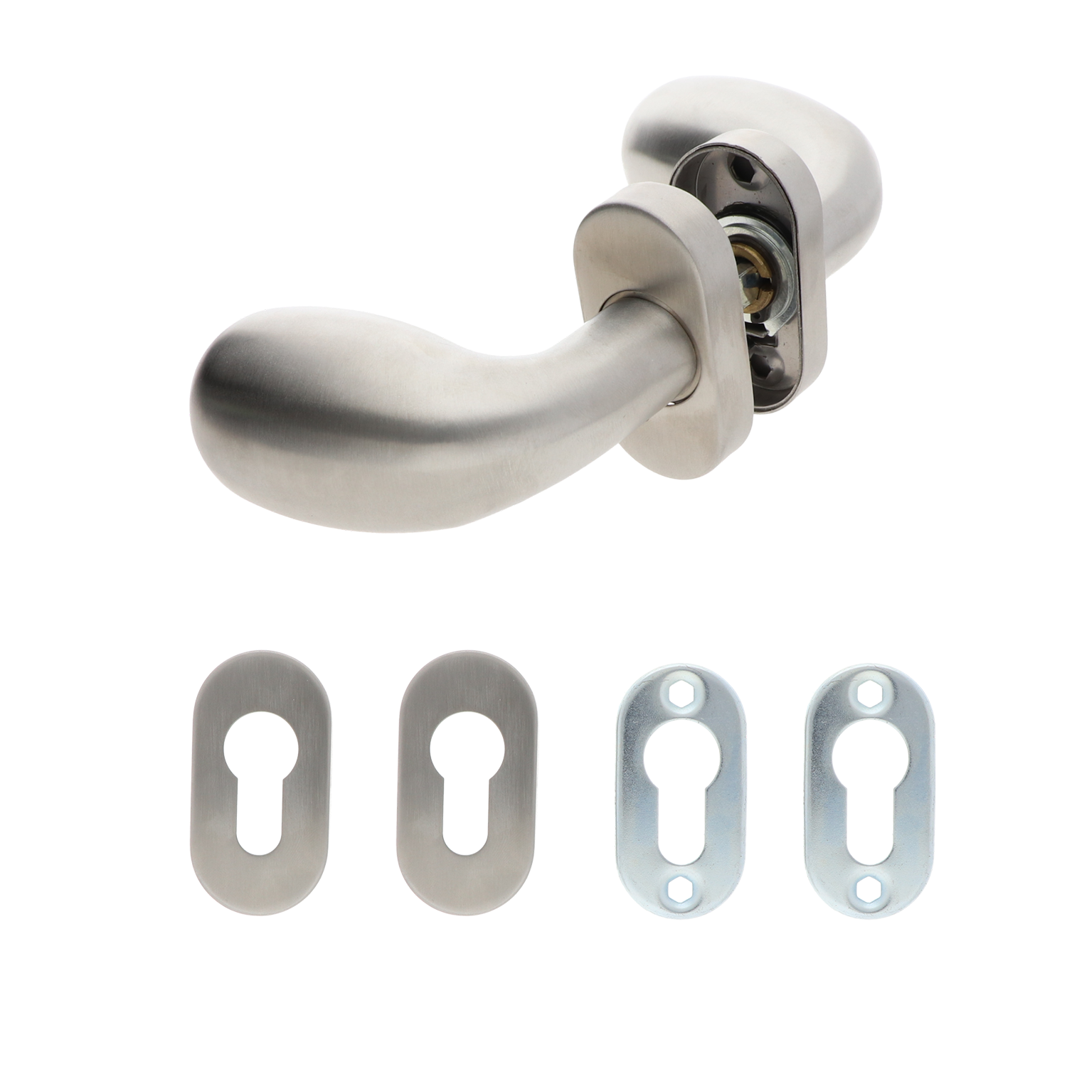 Oválná klika včetně spodní rozety, broušená nerez AISI304