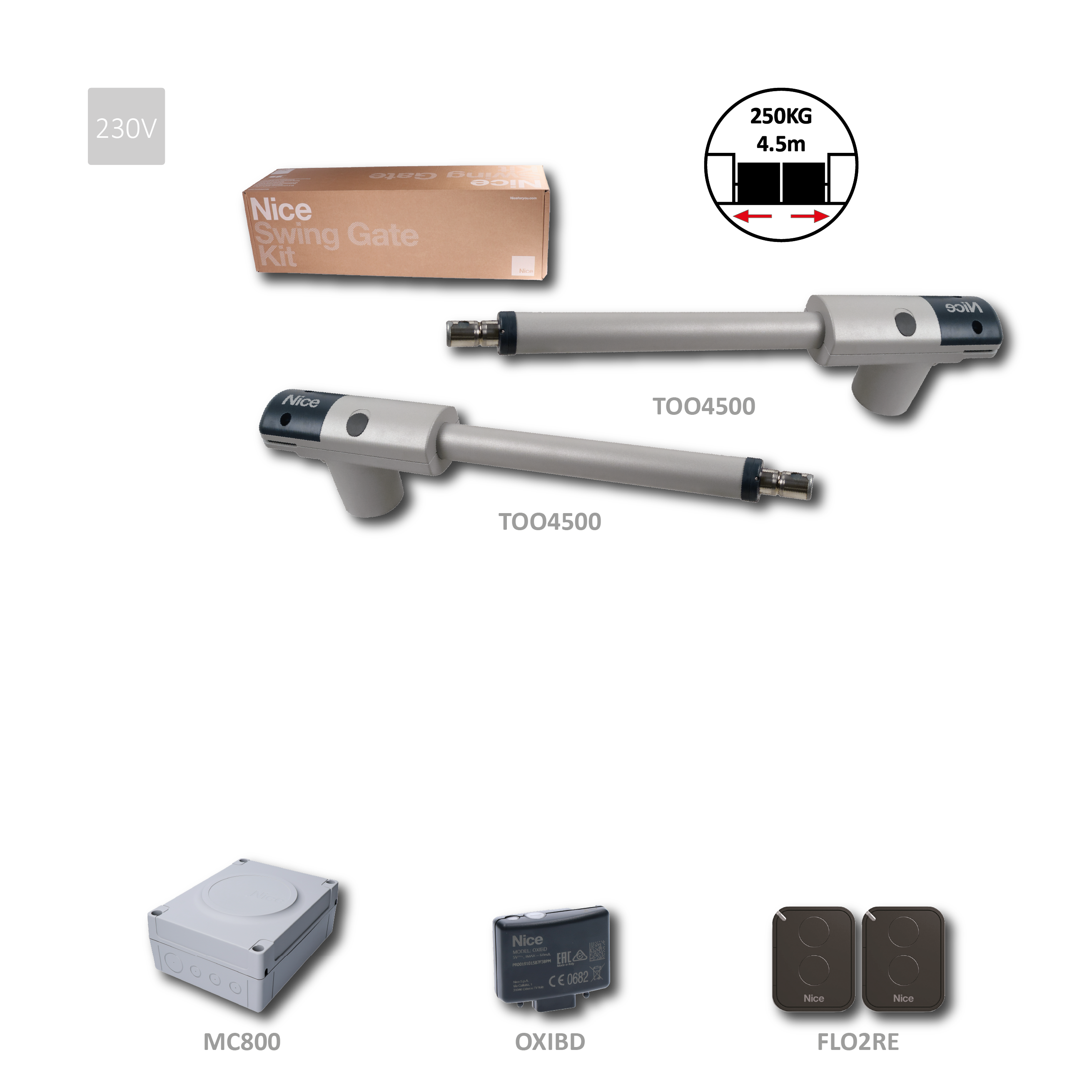 sklademTOO4500KLT sada pohonů pro dvoukřídlou bránu do 4,5m/křídlo, 2x TOO4500 (230V, 340W, 2000N), 1x MC800, 1x OXIBD, 2x FLO2REVlastnosti: Elektromechanický motor 230 V Vysoký výkon 340 W a točivý moment 2000 N pro křídla do 4,5 m Spolehlivost a tichý...