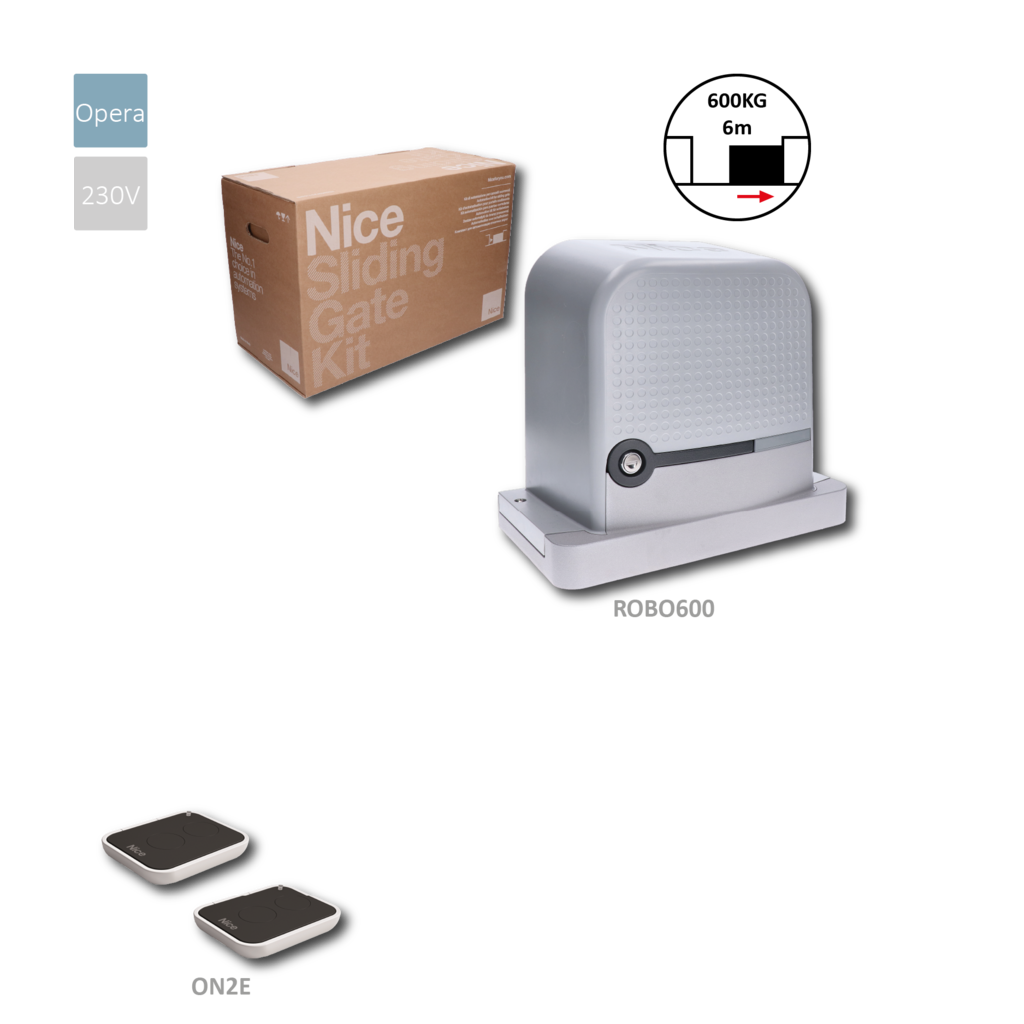 sklademNICE sada pro posuvnou bránu do 600kg, 1x ROBO600R10 (230V, 300W, 600N), se zabudovanou řídící jednotkou, se zabudovaným přijímačem, 2x ON2E Vlastnosti: Praktická a bezpečná: Pohon ROBO600R10 je vybaven integrovanou řídící jednotkou a přijímačem,...
