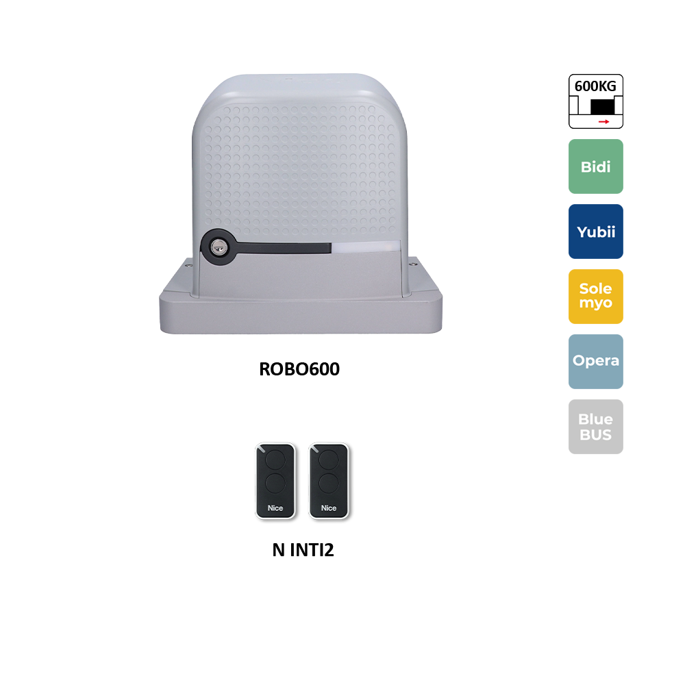 NICE sada pro posuvnou bránu do 600kg, 1x ROBO600R10 (230 V, 300 W, 600 N), se zabudovanou řídící jednotkou, se zabudovaným přijímačem, 2x ON2EVlastnosti:Praktická a bezpečná: Pohon ROBO600R10 je vybaven integrovanou řídící jednotkou a...