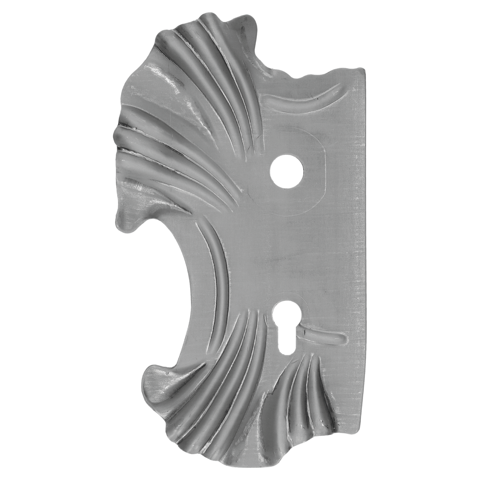 Úvod » Kované polotovary » Kliky, štítky, koule » Štítky » Štít 270x165x2mm s otvory, rozteč 90mm, otvor pro kliku ø 21mm, zdobený, levý, pro zámek ZM90/80
